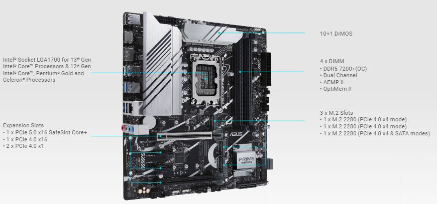 ASUS Prime series motherboards are expertly engineered to unleash the full potential of 13 th Gen Intel ® Core™ Processors. Boasting a robust power design, comprehensive cooling solutions and intelligent tuning options, PRIME Z790M-PLUS provides users and PC DIY builders with a range of performance optimizations via intuitive software and firmware features.