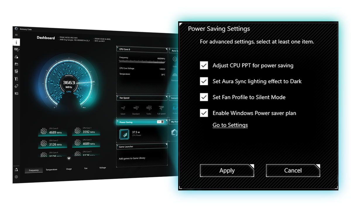 ASUS Intelligent Control makes your PC smart. Along with taking care of complex tuning and dynamically optimizing essential aspects of your system, it offers intelligently simplified options for newcomers to PC DIY, as well as more comprehensive features for seasoned veterans.