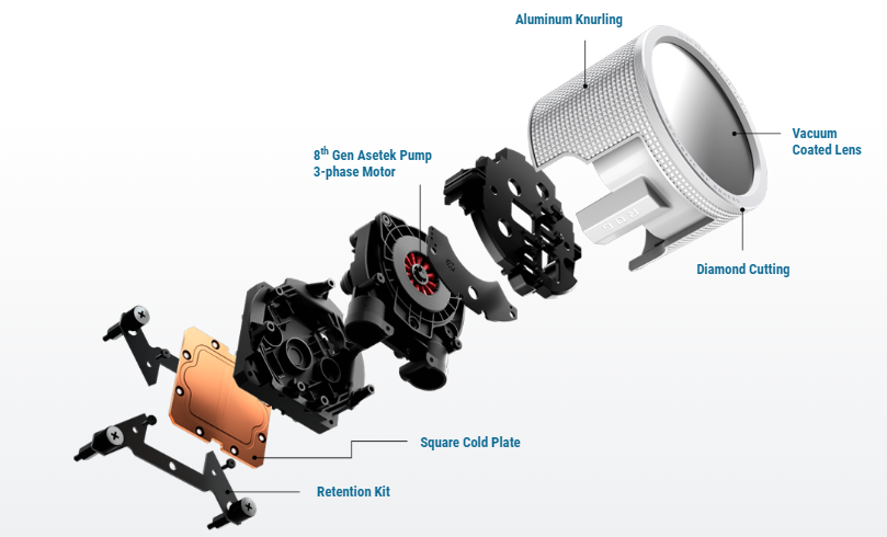 Coolant is passed to a high-volume radiator that for every 100 watts of load delivers 2 Celsius lower temperature than the last-gen design.