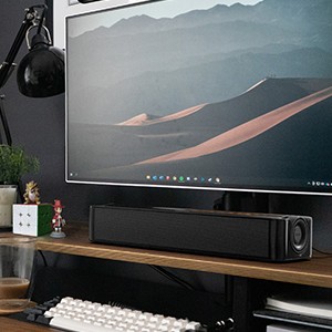 The Creative Stage SE powers up via a power adapter and connects to your computer with a single USB cable or wirelessly with Bluetooth 5.3. Its small footprint also allows for flexible placement under the monitor and well suited for smaller rooms. Plus, the soundbar is easy to set up and control, with the multi-functional knob conveniently located at the side of the soundbar for easy reach to power on or adjust volume.