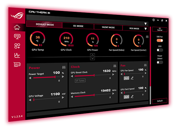 ASUS GPU Tweak III is more intuitive and feature-rich than ever before. A revamped interface offers greater accessibility by integrating core functions into a centralized dashboard, and our Voltage-Frequency tuner has been overhauled to make overclocking even easier. Additional goodies like 0dB fan technology, automatic profile swapping, a fully customizable on-screen display, and logging capabilities ensure that you get the most out of your graphics card.