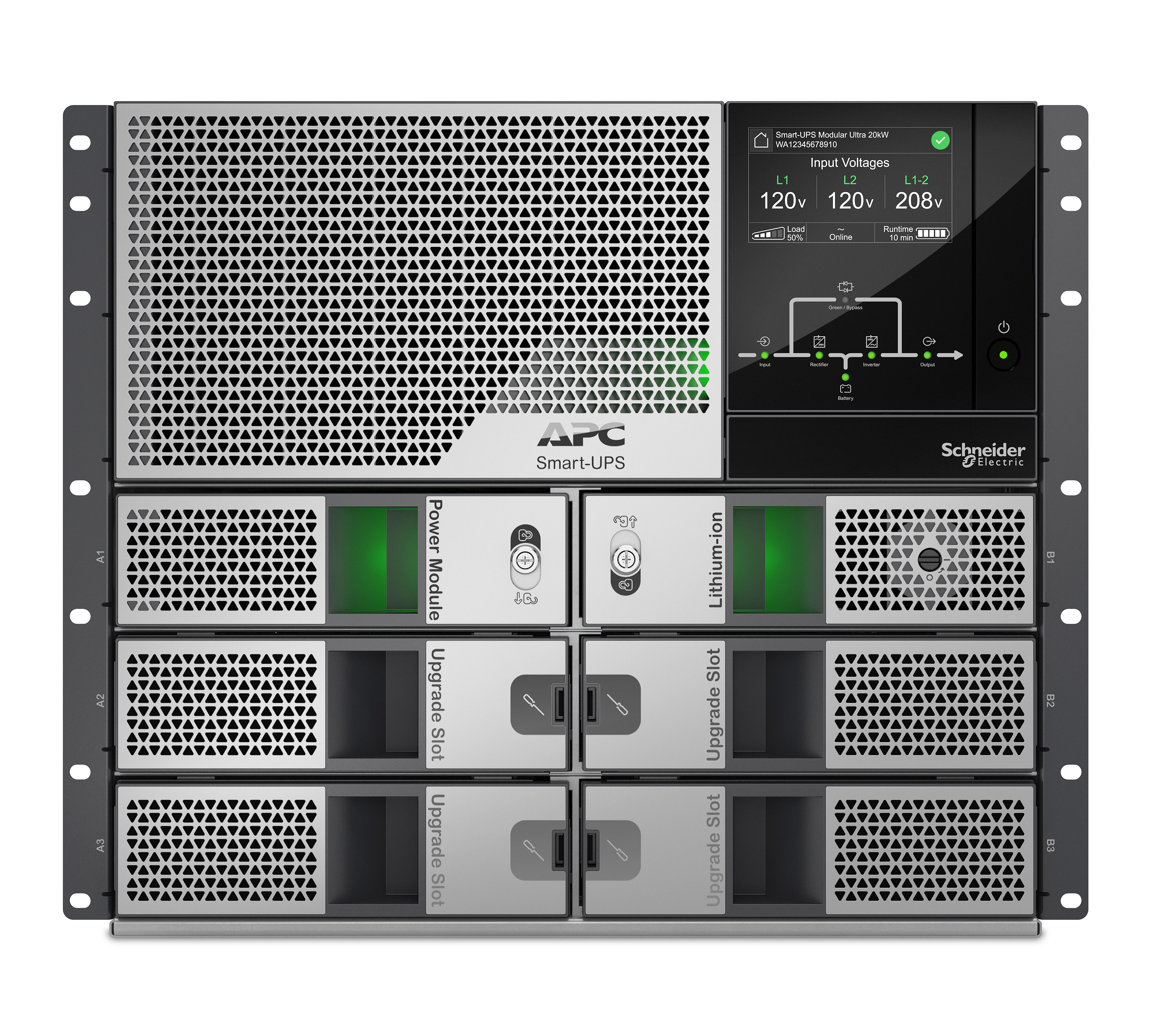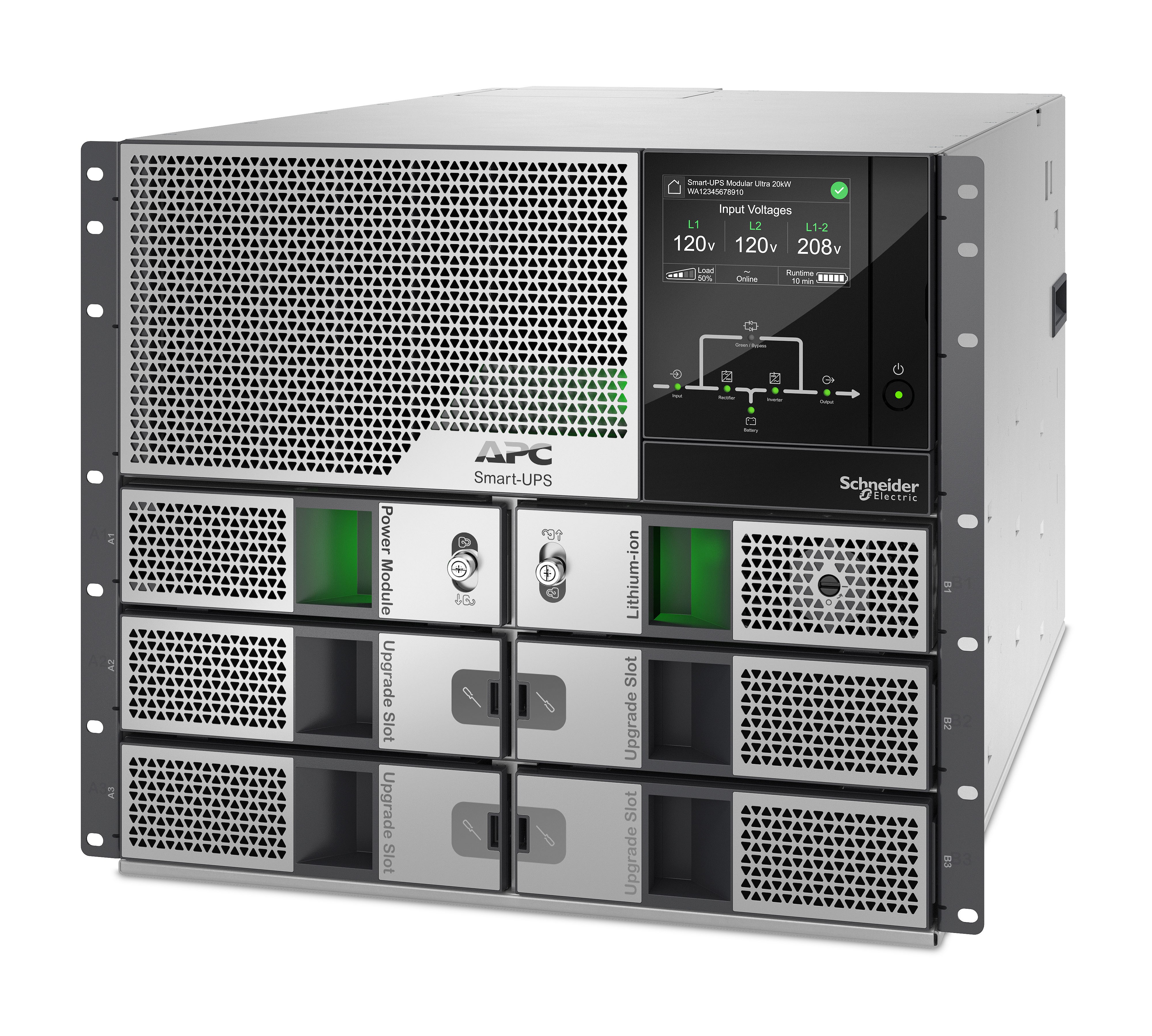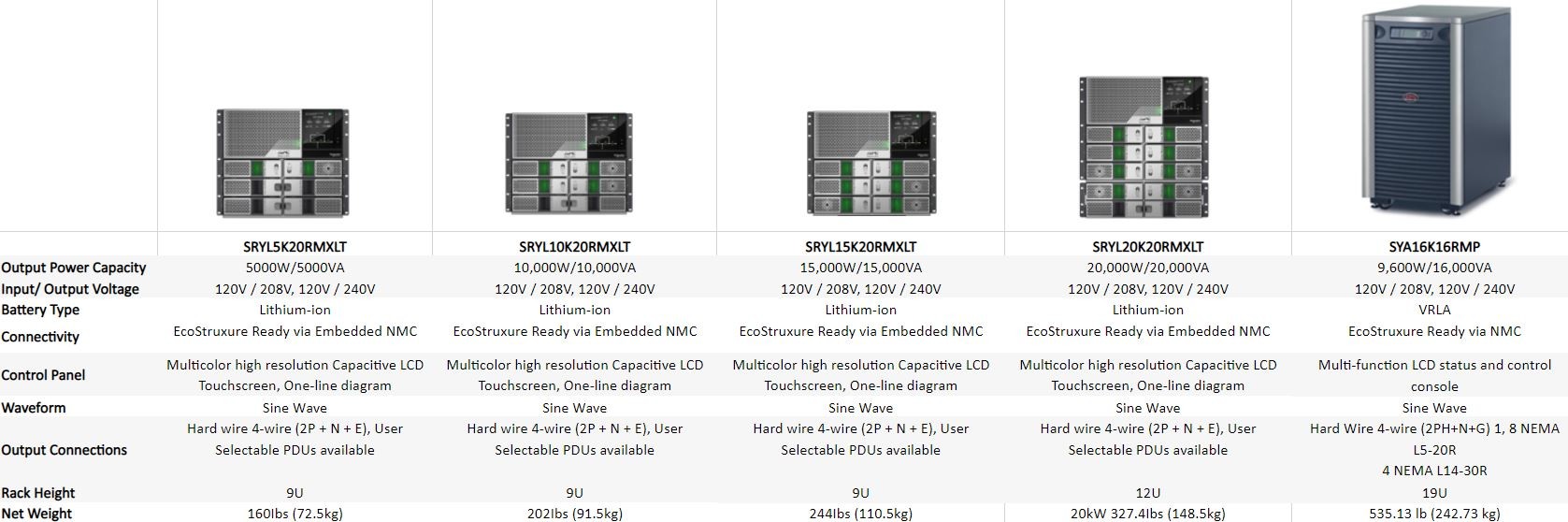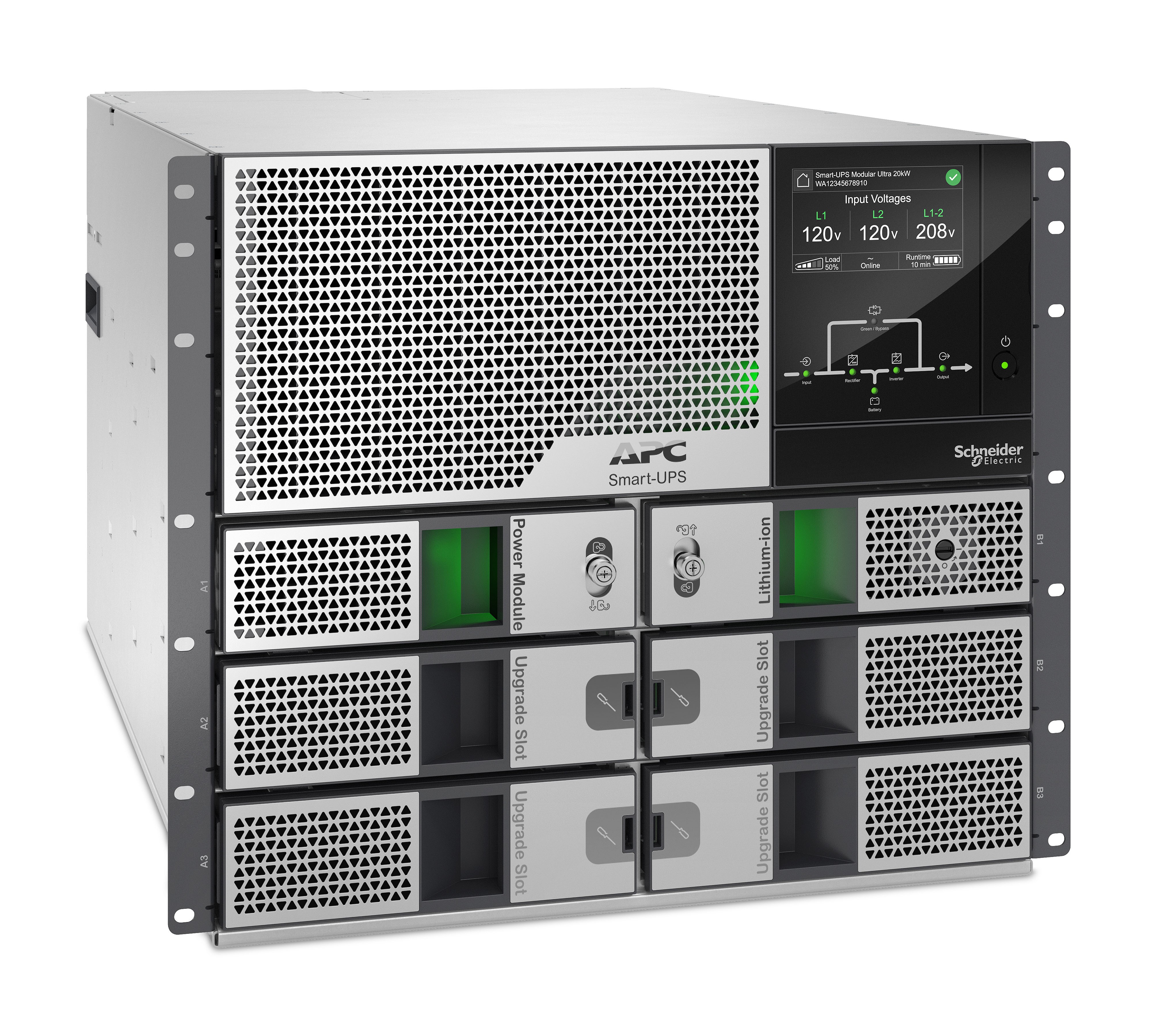 The APC Smart-UPS Modular Ultra 5kW scalable to 20kW with 120/208/240V split phase output. Its next generation semiconductor technology delivers up to 20kW in half the size of comparable UPSs. In addition to long lasting Lithium-ion batteries the weight is reduced by 60% in comparison to Lead Acid VRLA UPS. With the Embedded Network port you can monitor and manage your UPS anytime, anywhere.