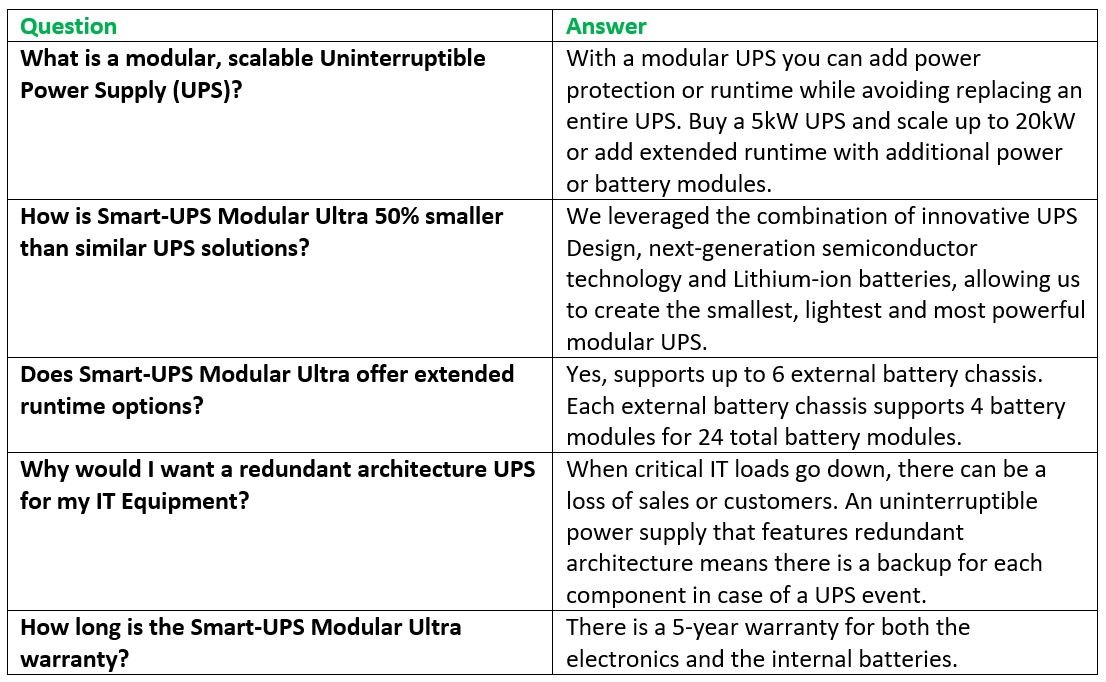 With 5kW of scalable single phase power protection in 9U, Smart-UPS Modular Ultra gives you more room and 2.5x more power for IT equipment than comparable Modular UPS.