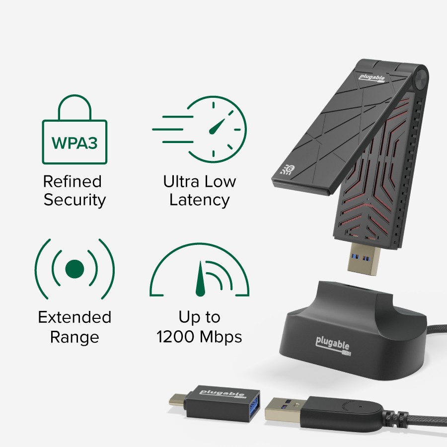 It doesn’t matter if you need a Wi-Fi adapter for a PC you’re building, or you just want to upgrade to the latest Wi-Fi standard on your laptop for a jump in performance, the Plugable USB-WIFIAX is your simple solution for upgrading to Wi-Fi 6. And with more of our work being done online, upgrading with a USB WiFi 6 adapter is a cost-effective way to extend the life of a computer. Get speeds up 1,201Mbps when you connect to a 5GHz network, and 573.5Mbps on a 2.4GHz network. Connect directly to your computer through USB, or USB-C. If interference is an issue, an included 45-inch (115 cm) extension cable lets you move your adapter to find the strongest signal. It even folds flat so you can take it with you. |