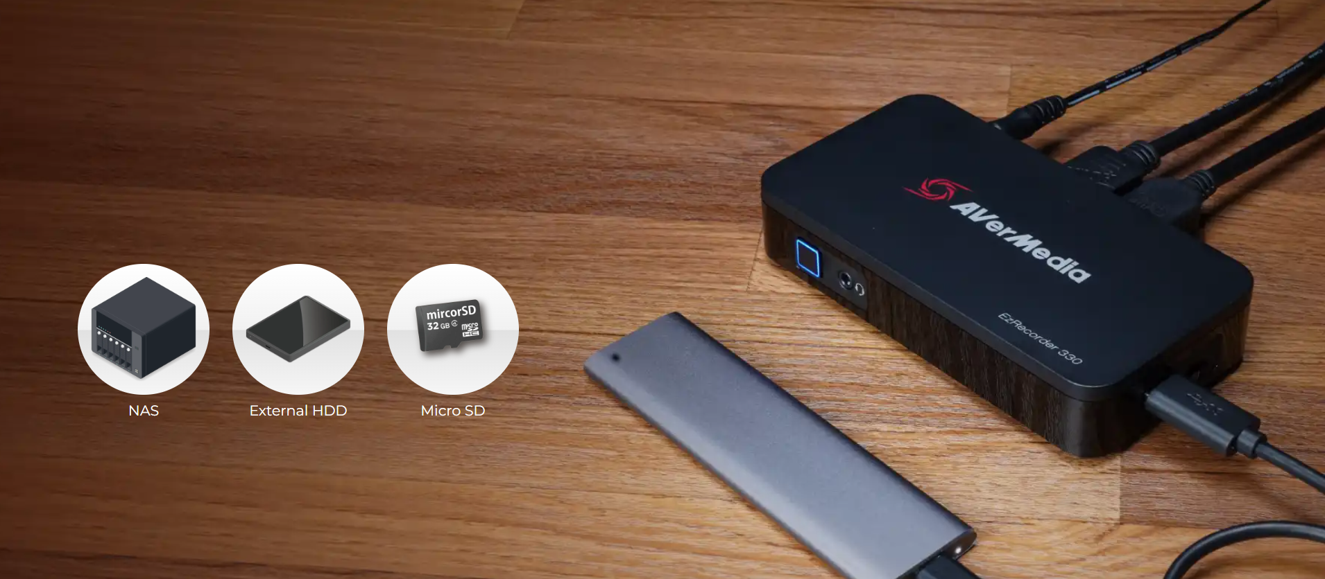The EzRecorder 330 supports recording to external hard drives, micro SD cards, and NAS. You can choose a suitable storage device according to your needs.