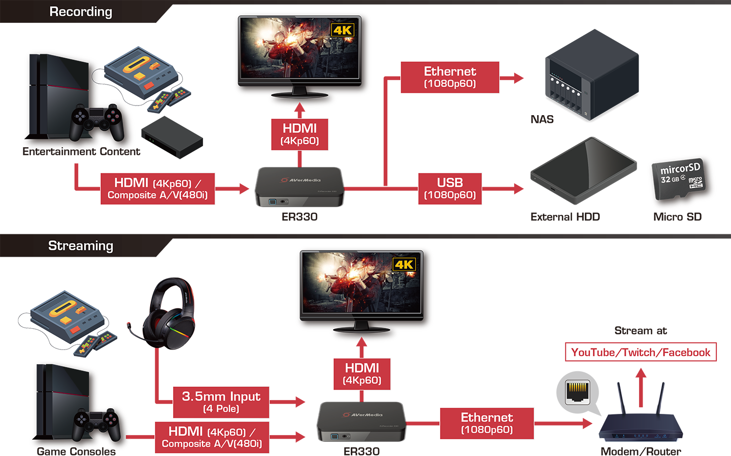 The EzRecorder 330 delivers the easiest live streaming experience. It only needs one button to stream and there’s no complex software or hardware setup. Simply connect a game console, camcorder or DSLR to your EzRecorder 330, and stream to YouTube, Facebook or Twitch without a computer. Live streaming is no longer a difficult task.