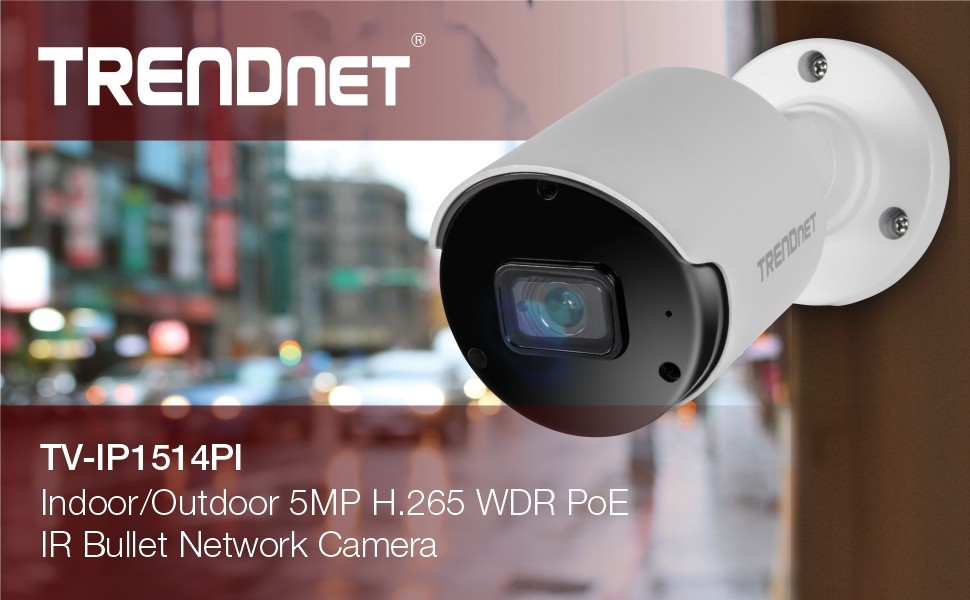 TRENDnet’s Indoor/Outdoor 5MP H.265 PoE IR Bullet Network Camera, model TV-IP1514PI, provides day and night surveillance with a night vision range of up to 30 meters (98 ft.). This bullet network camera delivers year-round surveillance with an IP66 weather rated housing to withstand outdoor environments. Record up to 5MP HD video at 20fps in a space saving H.265 compression format. Easily view live video from the 5MP PoE camera on your mobile device using our free Sentinel mobile app, or on your PC with our free View Manager desktop camera video management software.