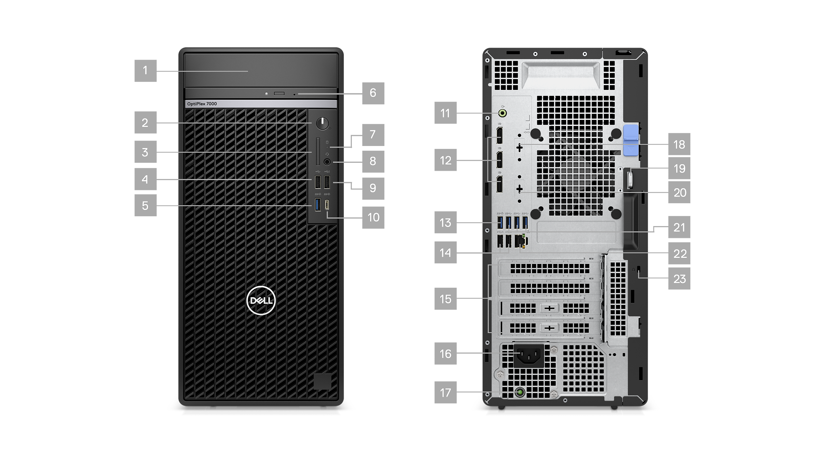 11. Line-out Re-tasking Line-in Audio Port 12. DisplayPort 1.4 Ports (3) 13. USB 3.2 Gen 2 14. USB 2.0 Ports with Smart Power On (2) 15. Full Height PCIe Expansion (4) 16. Power Connection 17. Power Diagnostic Light 18. Serial/PS2 Port (optional) 19. Padlock Loop 20. Optional video port (HDMI 2.0b/ DisplayPort 1.4a/ VGA/ USB Type-C with DisplayPort Alt mode) 21. USB 3.2 Gen 1 (3) 22. Ethernet RJ-45 23. K-Lock