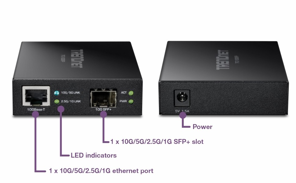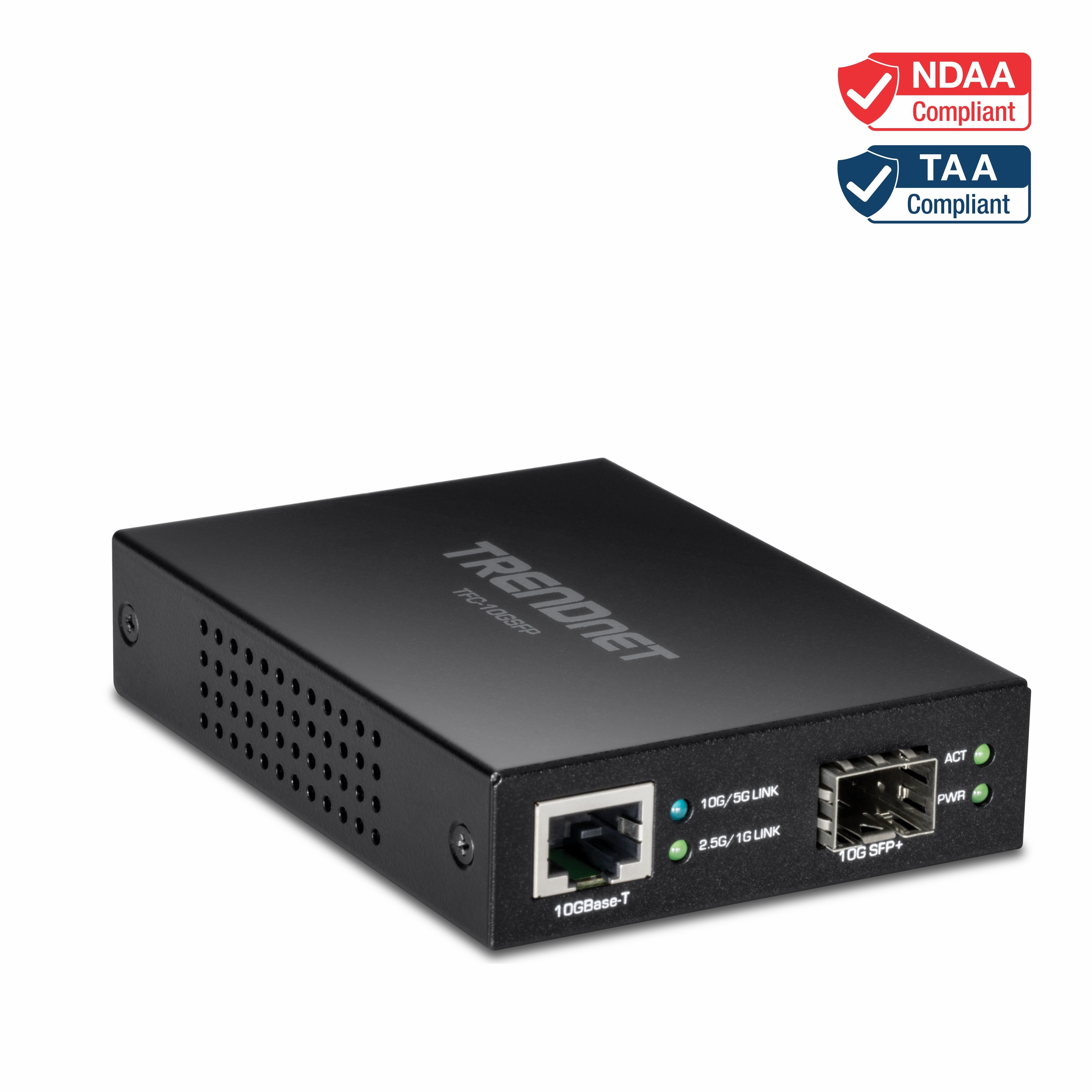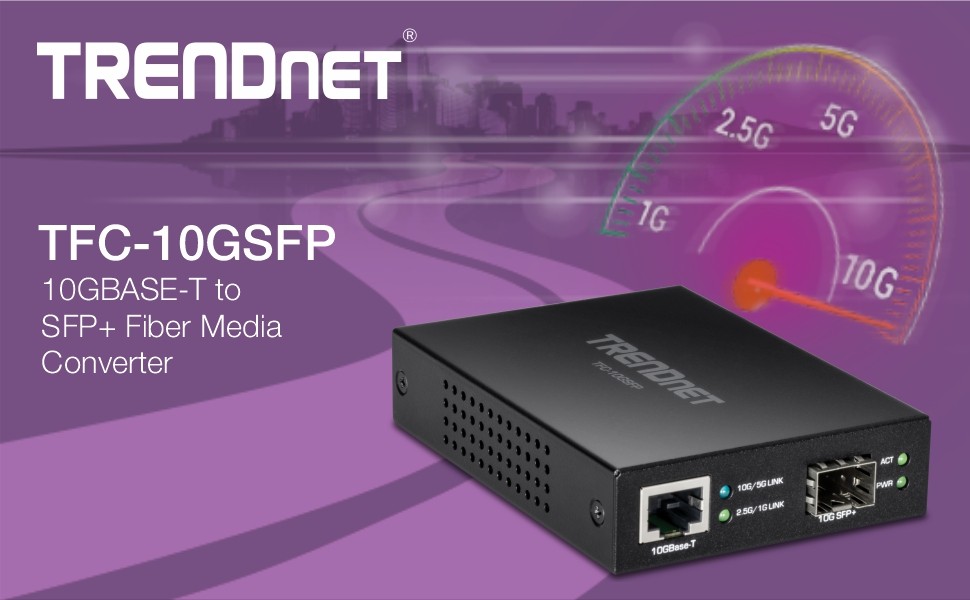 TRENDnet’s compact 10GBASE-T to SFP Fiber Media Converter, model TEG-10GSFP, converts a 10GBASE-T (Copper 10Gbps) ethernet connection to 10G BASE-SX/LX (Fiber) SFP media connection, and vice versa. The 10GBASE-T RJ-45 port on the 10G SFP+ transceiver supports a full-duplex 10G connection at wire speed. The SFP slot supports both multimode (SX) or single-mode (LX) SFP modules