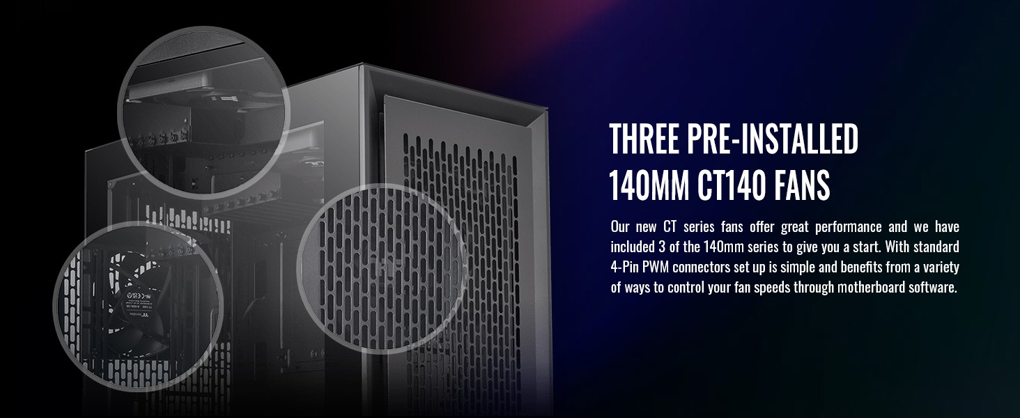 The CTE T500 Air brings the design philosophy of the CTE lineup to a more conventional style Full Tower chassis. Utilizing a single chamber, the CTE T500 Air keeps the 90-degree rotated motherboard to centralized main com-ponents of the system for optimal cooling. Able to support up to a 420mm A10 up front and up to a 360mm A10 in the rear, the T500 Air comes prein-stalled with three 140mm CT140 fans.