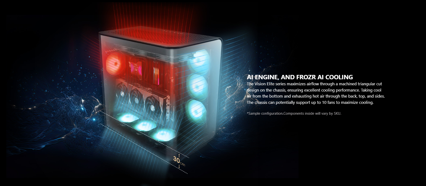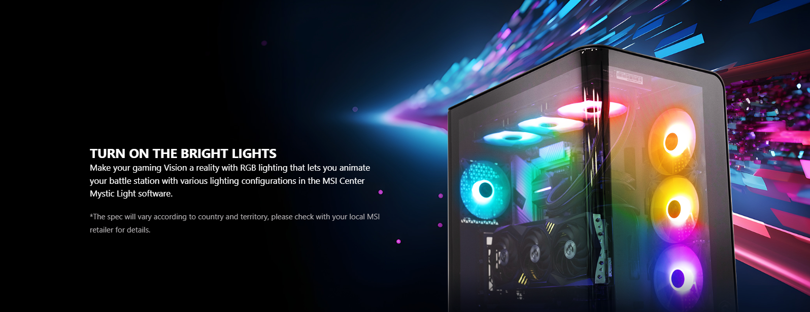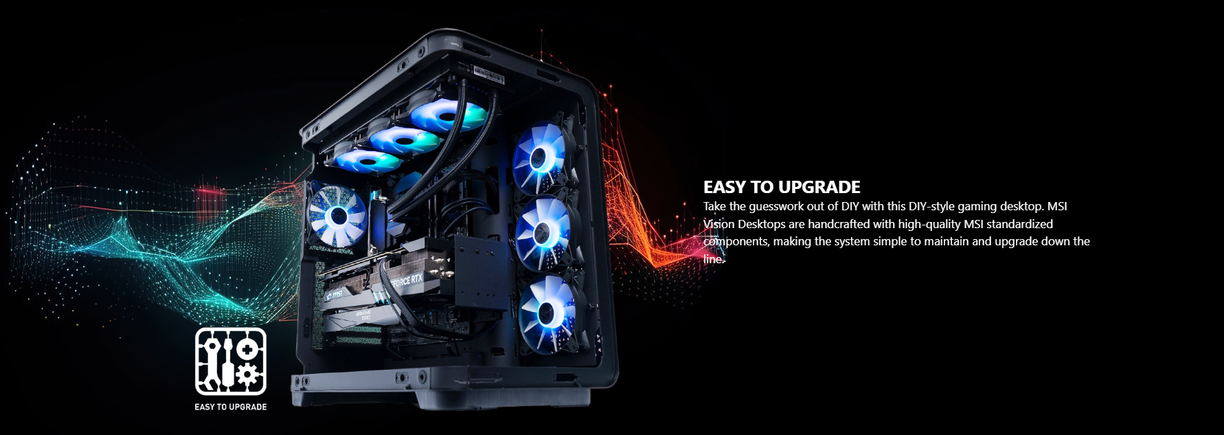 The new mesh-style front panel design drastically increases airflow to the system compared to previous generations. In addition, Frozr AI Cooling in MSI gaming desktops learns and predicts system temperature to adjust fan speed, ensuring peak performance in a low-noise environment with AI assistance.