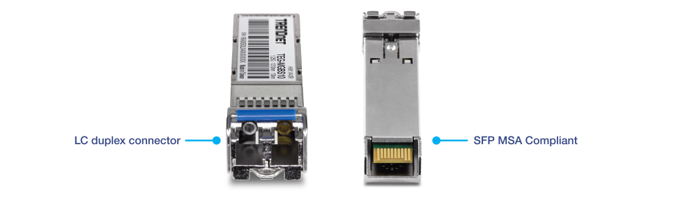 TRENDnet’s SFP Single Mode LC Modules are compatible with standard SFP slots found on network switches and fiber converters. Each single mode SFP transceiver is equipped with a duplex LC fiber connection interface, and supports high-speed data rates up to 1.25Gbps. All TRENDnet SFP fiber modules support connections for reliable, long distance network applications.