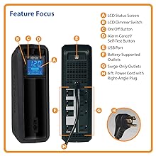 The illuminated LCD screen shows a variety of helpful data, including input voltage, battery capacity, power status, battery status and AVR status. You can rotate the LCD to match the orientation of the UPS system for optimal viewing, and a built-in dimmer switch adjusts the brightness of the LCD backlight.