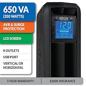 - Optimized Outlet Array: 4 outlets have both battery backup and surge/noise protection, and 4 have surge/noise protection without battery backup.