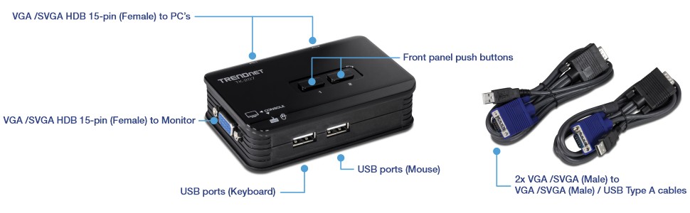 TRENDnet’s 2-Port USB KVM Switch, model TK-207K, allows you to manage two PCs with just one set of keyboard, monitor, and mouse. Switch between 2 PCs with a simple press of a button. Separate sets of KVM cables are included with the KVM Switch so that users can start controlling 2 PCs instantly. The KVM cables also provide power to the KVM Switch, eliminating the need for a power adapter. Hot Key operations provide immediate access to features such as computer switching, and auto-scanning. With its Hot-Plug and Audible Feedback, the 2-Port USB KVM Switch is an ideal choice for managing multiple PCs.