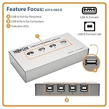 The U215-004-R is self-powered and requires minimal setup beyond loading the included software. Connect the USB-A port to your peripheral, and connect the four numbered USB-B ports to computers. Switch between computers with one touch using the switch push-buttons, your mouse or a keyboard hot-key command. The LEDs indicate which computer is currently using the peripheral.