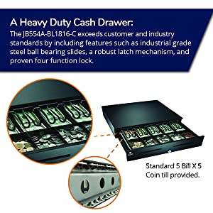 The cash drawer has industrial-grade ball bearings to allow the drawer to slide open and shut for high volume use.