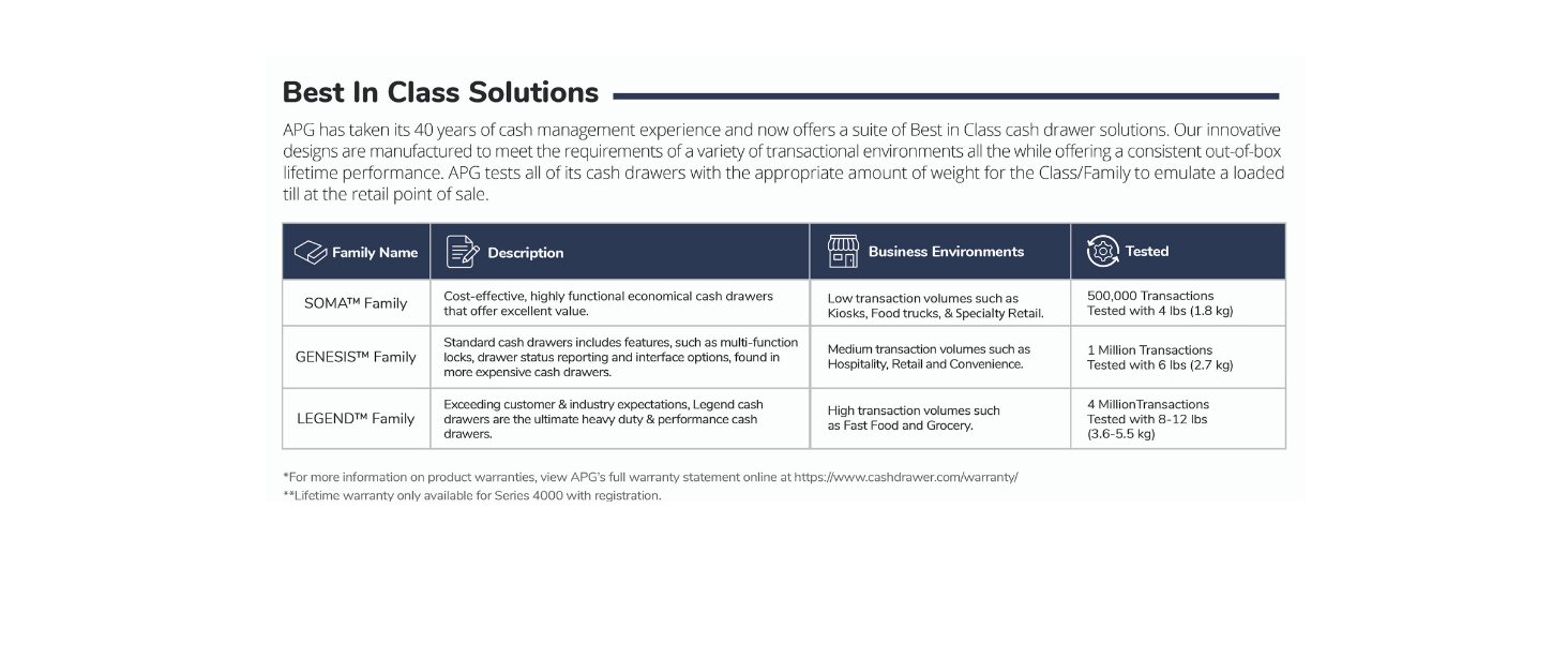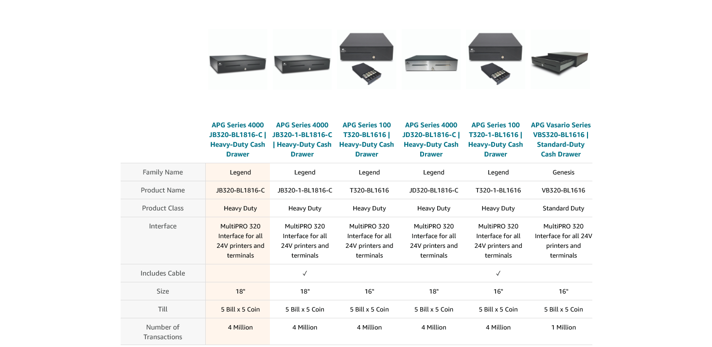 Equipped with APG’s MultiPRO 320 interface that is compatible with all 24V printer driven POS systems. Please note a connection cable is not included with purchase.