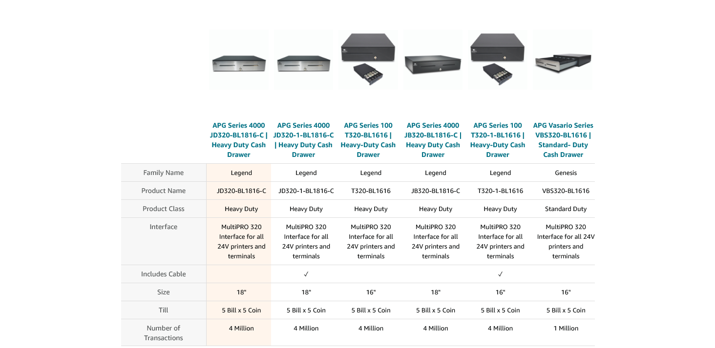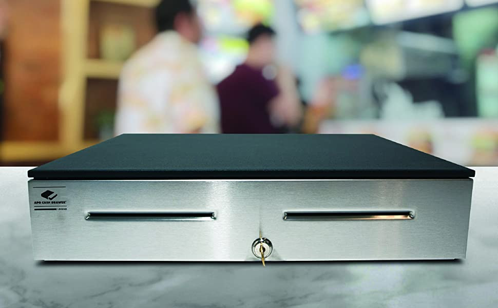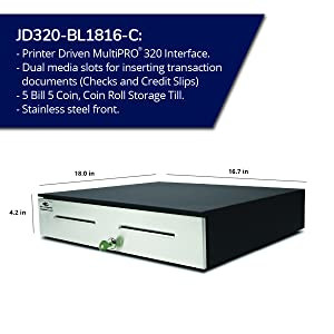 The APG JD320-BL1816-C heavy-duty stainless-steel-front cash drawer has a black powder-coated finish on the case and stainless steel front that resists stains, rusts, and corrosion. The cash drawer measures 18.0" x 16.7" x 4.2".
