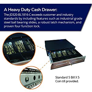 The cash drawer has industrial-grade ball bearings to allow the drawer to slide open and shut for high volume use and is made of steel for strength and durability.