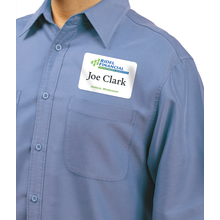 • Ideal for employee and visitor badges • Garment friendly clip holds firmly without damaging fabric • Clip attachment allows wearer to keep ID visible at all times • Feature an easy-to-load pocket style design • White, micro-perforated inserts separate cleanly, leaving smooth edges • Made from durable, soft plastic that displays names clearly