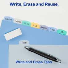 Tabs with plenty of room to be written on with a ballpoint pen or pencil. Reuse these dividers by simply erasing your old text and writing something new.