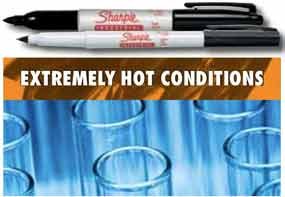 Industrial permanent markers by Sharpie provide a go-to solution for extremely hot situations. The markers feature industrial permanent ink that's not only heat resistant up to 500 degrees F, but that also offers fade- and water-resistant performance, not to mention quick-drying results. Industrial permanent markers work well for marking anything from glass test tubes to machinery. Fine and extra-fine tips available.