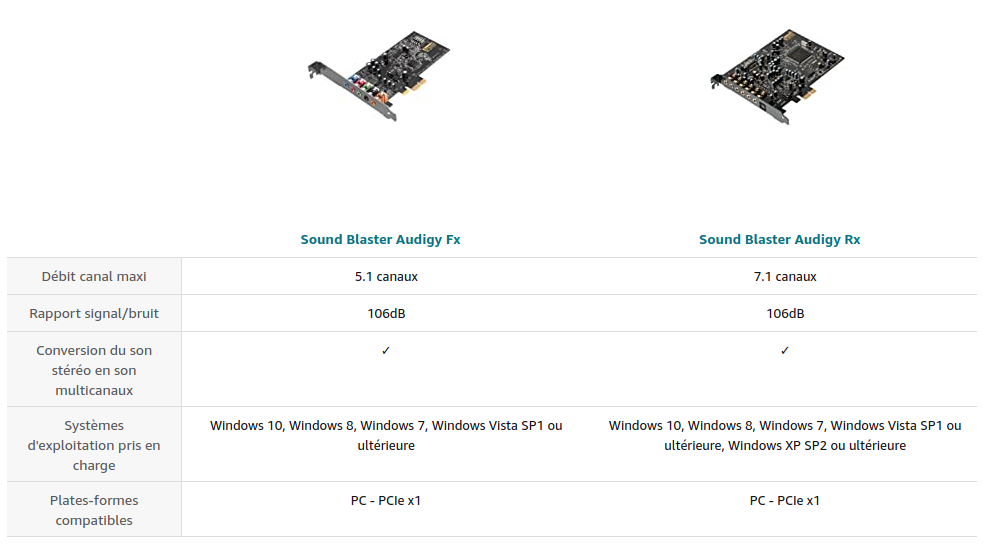 La Sound Blaster Audigy Rx est une carte son avancée qui représente la parfaite évolution entre l'audio de base produite par une carte mère et le son surround cinématique à immersion totale. Grâce à sa puce avancée conçue pour prendre en charge notre célèbre moteur de réverbération EAX, les utilisateurs de la Sound Blaster Audigy Rx accèdent à une expérience audio 7.1 multicanaux inégalée. Elle offre en outre un rapport signal/bruit de 106 dB et intègre le Panneau de contrôle de Sound Blaster Audigy Rx, un logiciel PC dédié qui permet un contrôle total de tous les paramètres de votre carte son.