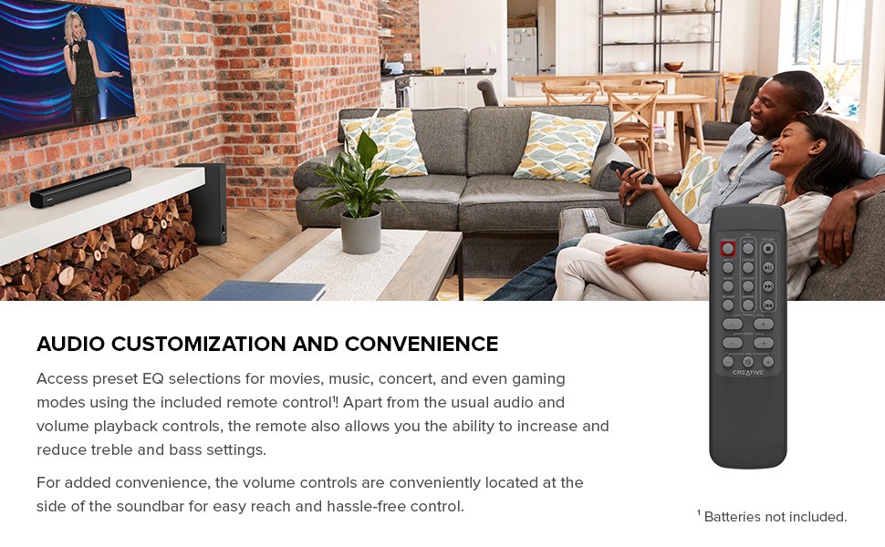 We have set the stage for an all-encompassing audio entertainment for your room. Creative Stage features a high performance, under-monitor soundbar for your computer and TV. The accompanying subwoofer provides the perfect enhancement for rich, thumping bass that reverberates throughout the room. With a myriad of connectivity options, this is the perfect audio entertainment system for use whether at a desktop computer set-up or in the living room. Enjoy immersive, room-filling audio with amazing bass on the Creative Stage!