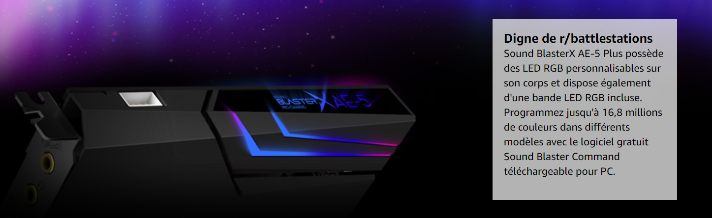 Soyez l'un des fiers OPs qui exhibent leurs plates-formes de jeu sur r/battlestations ! La Sound BlasterX AE-5 Plus est une parfaite convergence entre l'esthétique et la performance, incluant une carte son de jeu PCI-e haute résolution SABRE32 ultra-classe et un DAC doté de LED RGB personnalisables sur sa structure. Elle est livrée avec une bande LED RGB incluse. Elle comprend également notre amplificateur de casque discret Xamp primé qui utilise une technologie de bi-amplification, ainsi que notre suite complète de technologies de traitement audio de premier plan, comprenant la virtualisation surround.