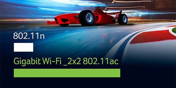 Standard Gigabit Wi-Fi 2x2 802.11ac w wersji z kanałem 160 MHz (1733 Mb/s) zapewnia nawet dwunastokrotnie większą szybkość2 niż standard 802.11n.